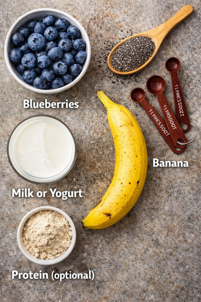- 1 scoop protein powder (for a blueberry protein smoothie)